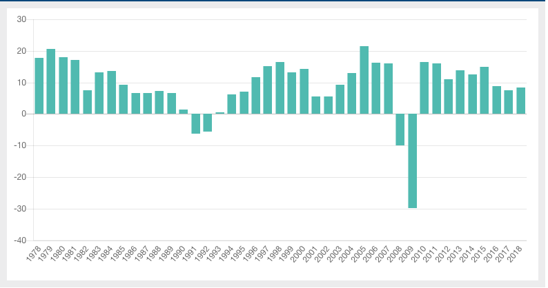 The National Council of Real Estate Investment Fiduciaries (NCREIF) Fund Index – Open End Diversified Core Equity, also known as the NFI-ODCE Index, is utilized as an institutional real estate performance benchmark. The NFI-ODCE Index is an index of investments returns (gross of fees) of the largest private real estate funds pursuing a core investment strategy which is typically characterized by low risk, low leverage (less than 40%), and stable properties diversified across the US.Below are the returns of the NFI-ODCE Index since its inception in 1978.